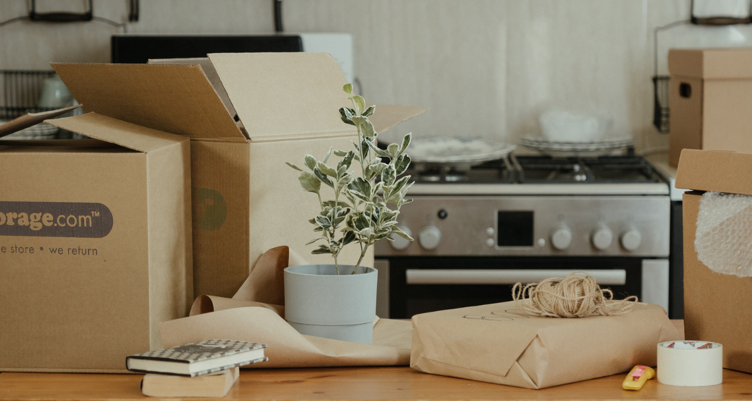 A plant in the kitchen with moving boxes